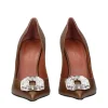 The product with MPN CAMELIAPUMP105PEARLYNAPPAMOCHA and code F84591 leather in brown is a pumps designed by Amina Muaddi. It has features like front detail, rhinestone.
