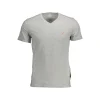 Embrace effortless style with Guess Jeans’ slim-fit marvel. This brown V-neck t-shirt epitomizes contemporary fashion, exquisitely tailored with short sleeves and adorned with the iconic Guess logo – a testament to individuality and trendsetting. Crafted from a blend that boasts 95% organic cotton, it’s a conscious choice for the fashion-forward. Elevate your casual wear with this essential piece.
