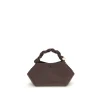 Ganni’s Bou small grained Handbag stands out for its elegant grainy texture and refined details. It features a tone-on-tone GANNI Butterfly logo and an embossed logo on the back, accompanied by metal nuts engraved with logo and butterfly. The braided top knot handle lends a handcrafted touch, while the adjustable and removable shoulder strap offers versatility. The interior magnetic closure ensures security, with a single functional compartment.