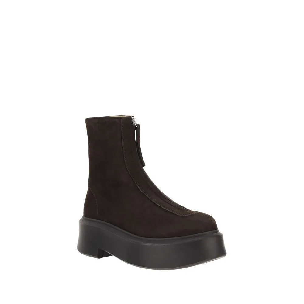 Calfskin Boots by The Row, front zipper closure, round toe, platform sole, suede design.