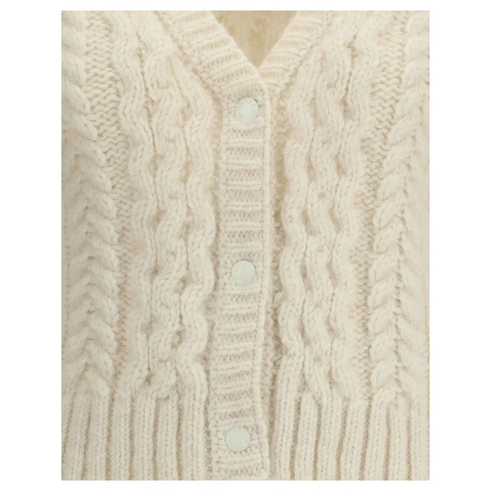 The V-neck cardigan by Moncler is reimagined with a contemporary twist through refined textures. Crafted from a luxurious blend of nylon, wool, alpaca, and mohair, it features a distinctive cable and Aran knit that adds depth and a unique tactile feel. The button closure enhances its understated elegance, while the signature Moncler logo patch lends an iconic touch. With its cozy fit and sophisticated finish, this cardigan stands out as a seasonal must-have, perfect for adding both warmth and style to everyday looks.