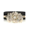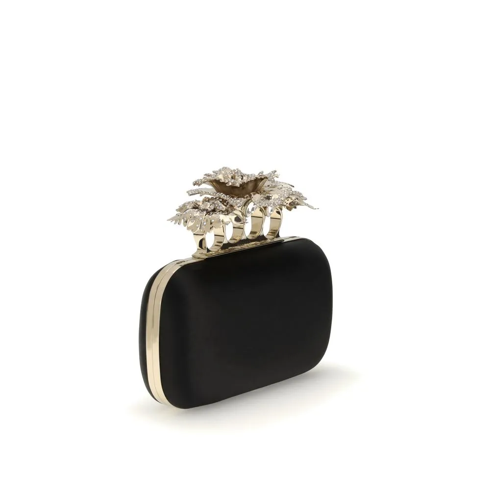 The Carnation Knuckle Clutch by McQueen features a black silk satin base and a metal knuckle handle adorned with a crystal-encrusted carnation flower in a polished light gold finish. It can be worn by hand or over the shoulder thanks to the gold-finish chain, combining elegance and versatility in a standout accessory.