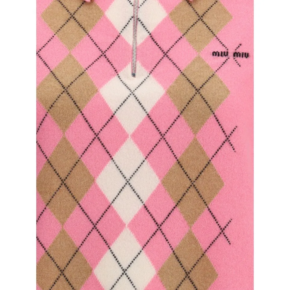 The cashmere zip Polo by Miu Miu reimagines a timeless staple with a refined Argyle intarsia pattern. Soft and luxurious, it is defined by contemporary elegance and crafted details such as the English shoulder, ribbed cuffs and hem. The regular fit and zip-front closure highlight its versatile nature, while the intarsia logo adds a signature, distinctive touch.