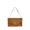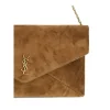 The Cassandre Shoulder Bag by Saint Laurent is an extra-large suede clutch with a sleek and contemporary design. Featuring a stowable cable chain and metallic CASSANDRE decoration, it can be worn on the shoulder or carried by hand for sophisticated versatility. Bronze-colored metal hardware adds a vintage touch, while the cotton-lined interior features a zippered pocket. The snap-button closure completes the design with practicality and style.