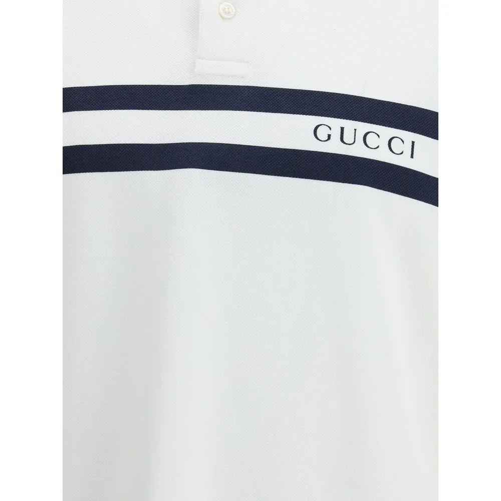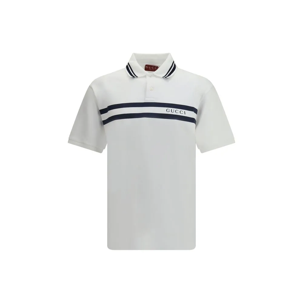 The white stretch Cotton Polo Shirt by Gucci, with a relaxed and comfortable fit, is enhanced by a striped print and the Gucci logo centered on the front, for a modern and distinctive look.