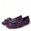 Gorgeous, brand new with tags 100% Authentic Dolce & Gabbana elegant Vally shoes are exquisitely crafted in Italy from the finest Taormina lace. Seen here in purple, these pretty floral lace Vally slippers from Dolce & Gabbana will instantly lift your look to new sartorial heights. Featuring an almond toe, a branded leather insole and a wearable flat leather sole, these beauties are finished with a sparkling decorative crystal flower on the front.