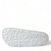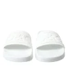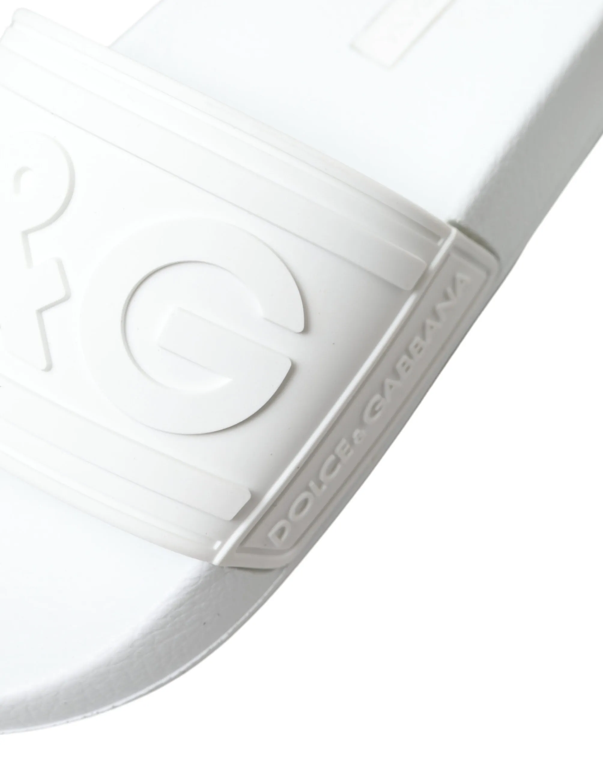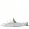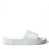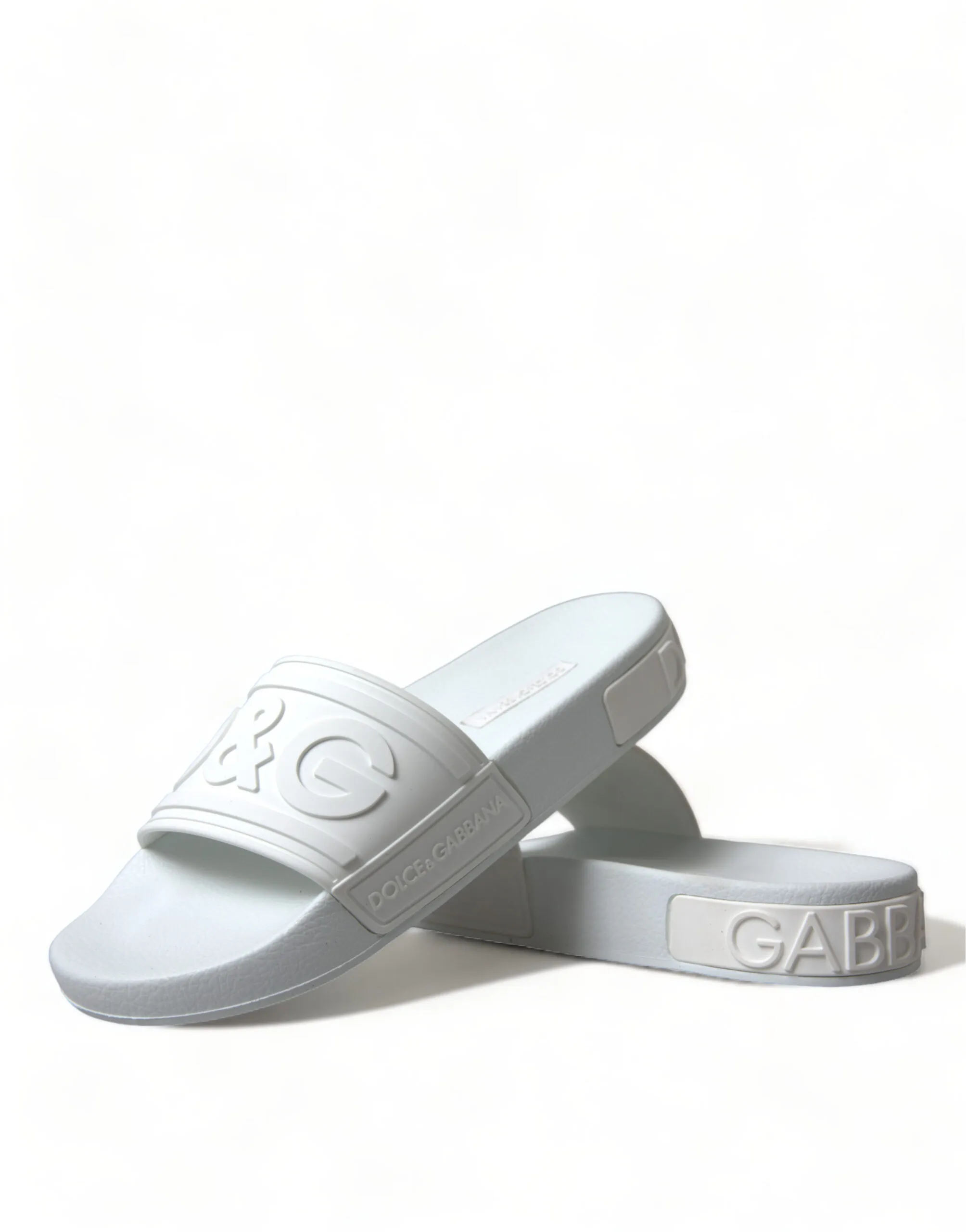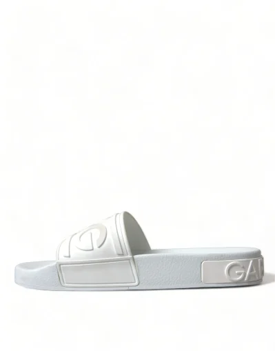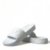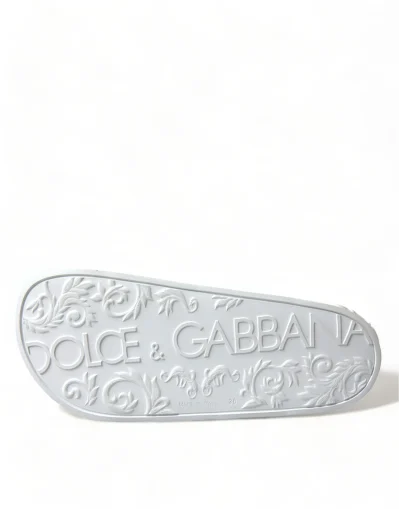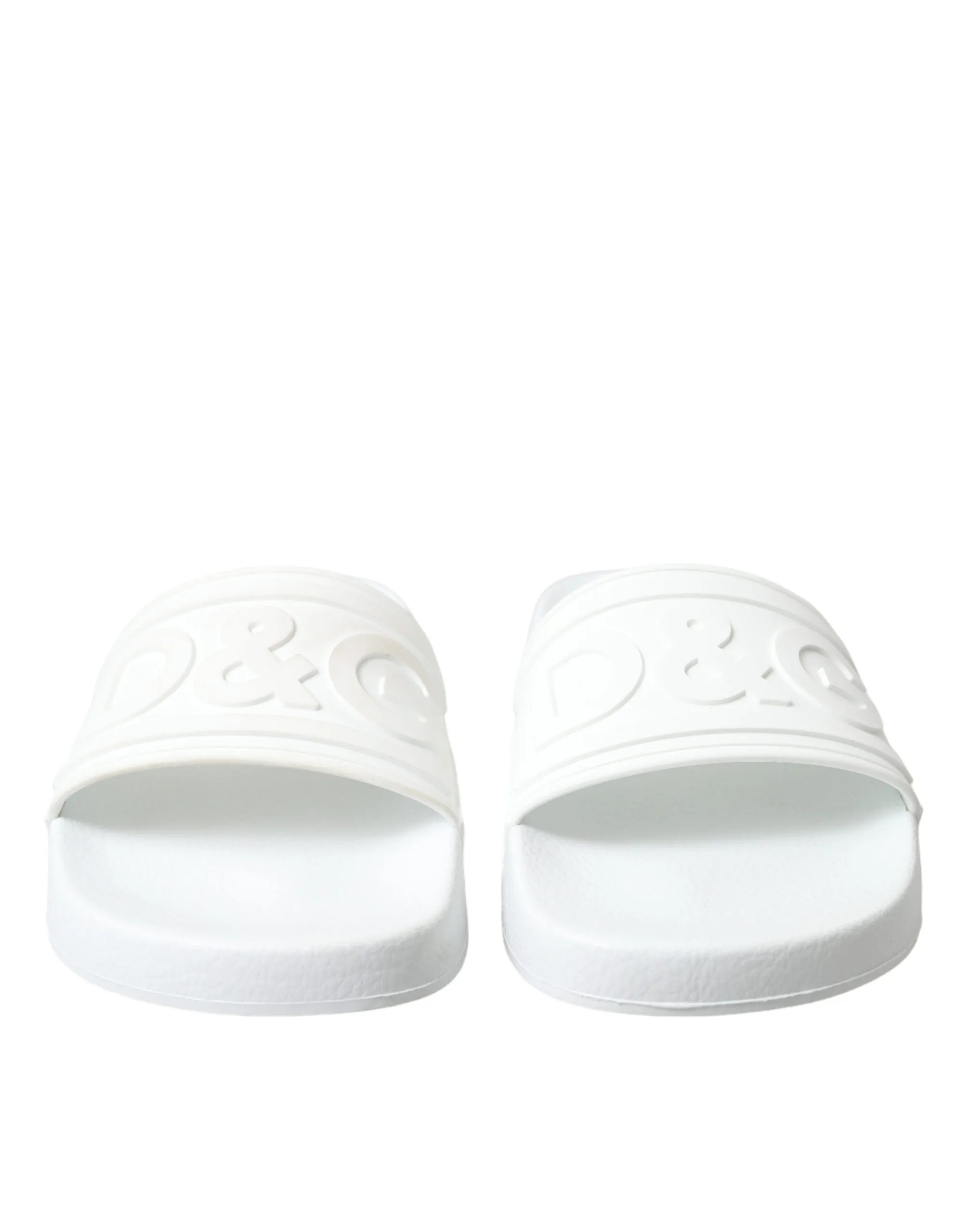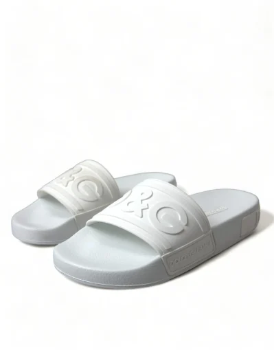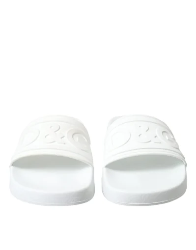 Gorgeous brand new with tags, 100% Authentic Dolce & Gabbana white logo embossed slides are crafted with rubber in Italy and feature a wide strap and heel counter with tonal branding, a molded footbed and a lightweight sole.