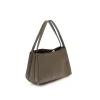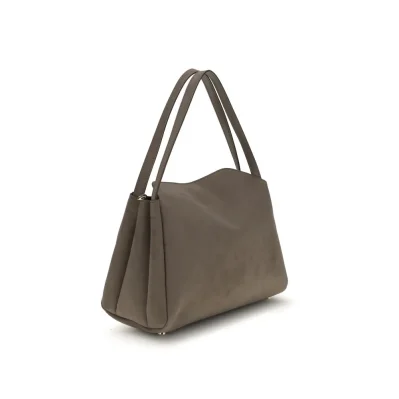 Eudora Shoulder Bag by Themoirè is a modern, sustainable design accessory made from vegan suede. Featuring a trapeze silhouette, it has two leather handles that complement its elegant aesthetic. The swivel closure adds a refined touch, while feet at the base provide stability and protection. A perfect balance of contemporary style and environmental awareness.