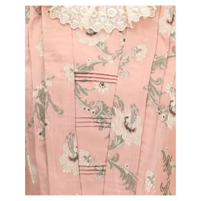 The fitted jacket in jacquard taffeta and lace by Chloé captures a baroque spirit through exquisite craftsmanship. Made from a silk-blend floral jacquard, it is adorned with lace detailing and puffed shoulders that enhance its romantic, dramatic silhouette. The hook-and-eye front fastening adds a refined touch to the structured design, balancing heritage tailoring with contemporary sensibility. This piece was created in collaboration with Akanjo, a WFTO-certified social enterprise and long-time partner of Chloé. Based in Madagascar, Akanjo is committed to fair wages, workers’ wellbeing, and the preservation of artisanal techniques, giving this jacket both an ethical and aesthetic value.