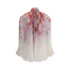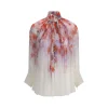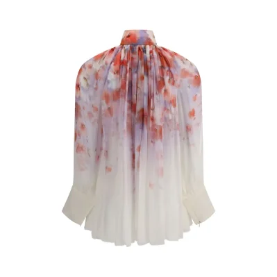 Zimmermann’s Crush Blouse is an elegant, lightweight piece featuring an eye-catching all-over floral print. The button-front closure and semi-sheer design lend a delicate allure, while the draped details add movement and femininity to the style.