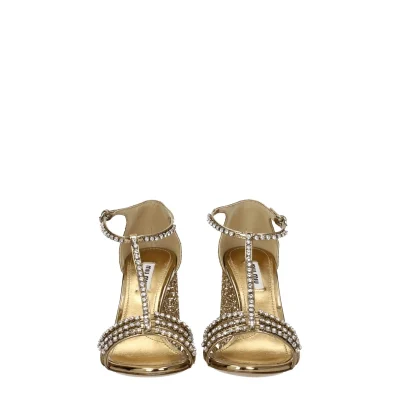 The product with MPN 5X732D3LKS100F0522 and code F76684 glitter in gold is a sandals designed by Miu Miu. It has features like rhinestone.