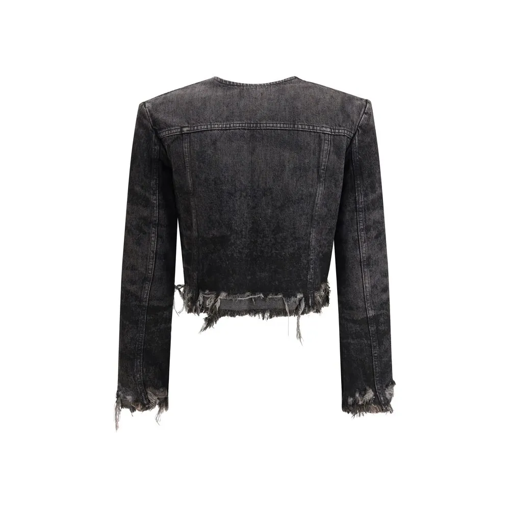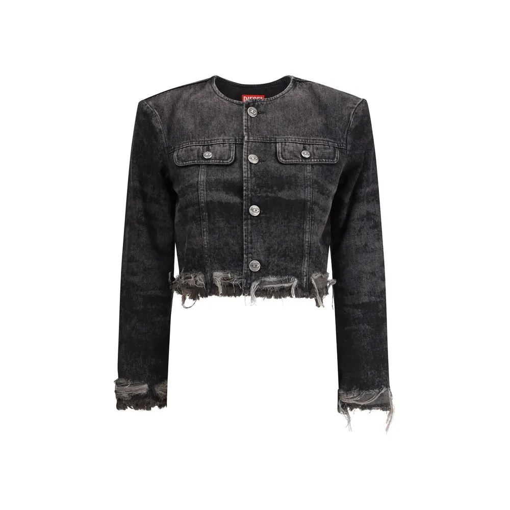 The laser-engraved cotton-hemp denim Jacket by Diesel offers a tailored reinterpretation of the classic trucker jacket, blending craftsmanship with a contemporary edge. Part of the Runway Fall Winter 25 collection, it features a cropped, collarless silhouette with bold frayed edges that emphasize its deconstructed appeal. Made from a refined cotton-hemp blend, the stonewashed denim showcases laser-drawn graphics in shades of grey, creating a distinctive and sophisticated visual texture. The design is completed by a metal button closure, chest pockets with button flaps, and a lined interior, combining style and practicality in true Diesel fashion.