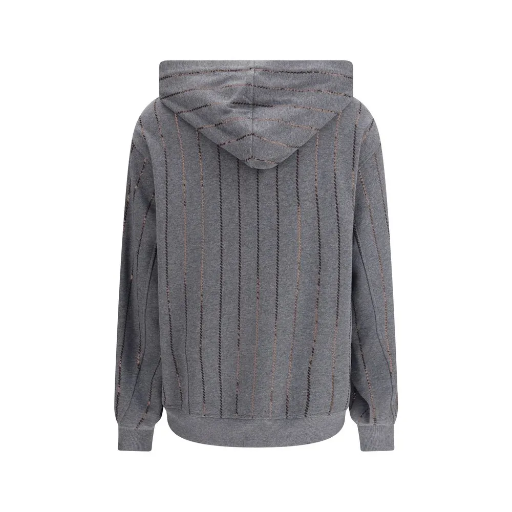 The cotton Sweatshirt by Brunello Cucinelli blends comfort and refinement in a piece with a modern, relaxed spirit. The hood and ribbed trims define a balanced sporty silhouette, while the dazzling chalk stripe sequin embroidery adds a subtle sparkle and signature sophistication. The long sleeves with cuffs complete the design, making this sweatshirt a perfect choice for effortlessly elegant casual looks and moments of refined leisure.