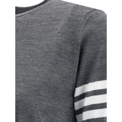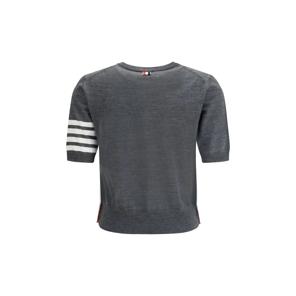 Thom Browne’s knit T-Shirt is a garment with a clean and distinctive style. With a ribbed crew neck and hems, it features the brand’s iconic bands on the left sleeve, a detail that underscores its unique identity. The ribbed hem with slight side slits adds a touch of modernity and comfort, making it perfect for a casual yet sophisticated look. A versatile must-have for any wardrobe.