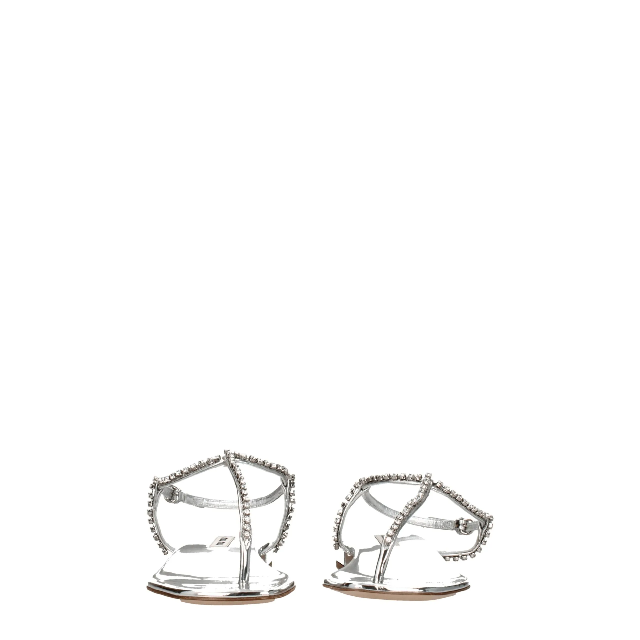 The product with MPN 5Y920D3L1N010F0118 and code F76545 leather in silver is a flip flops designed by Miu Miu. It has features like metallic effect, rhinestone.