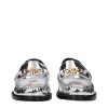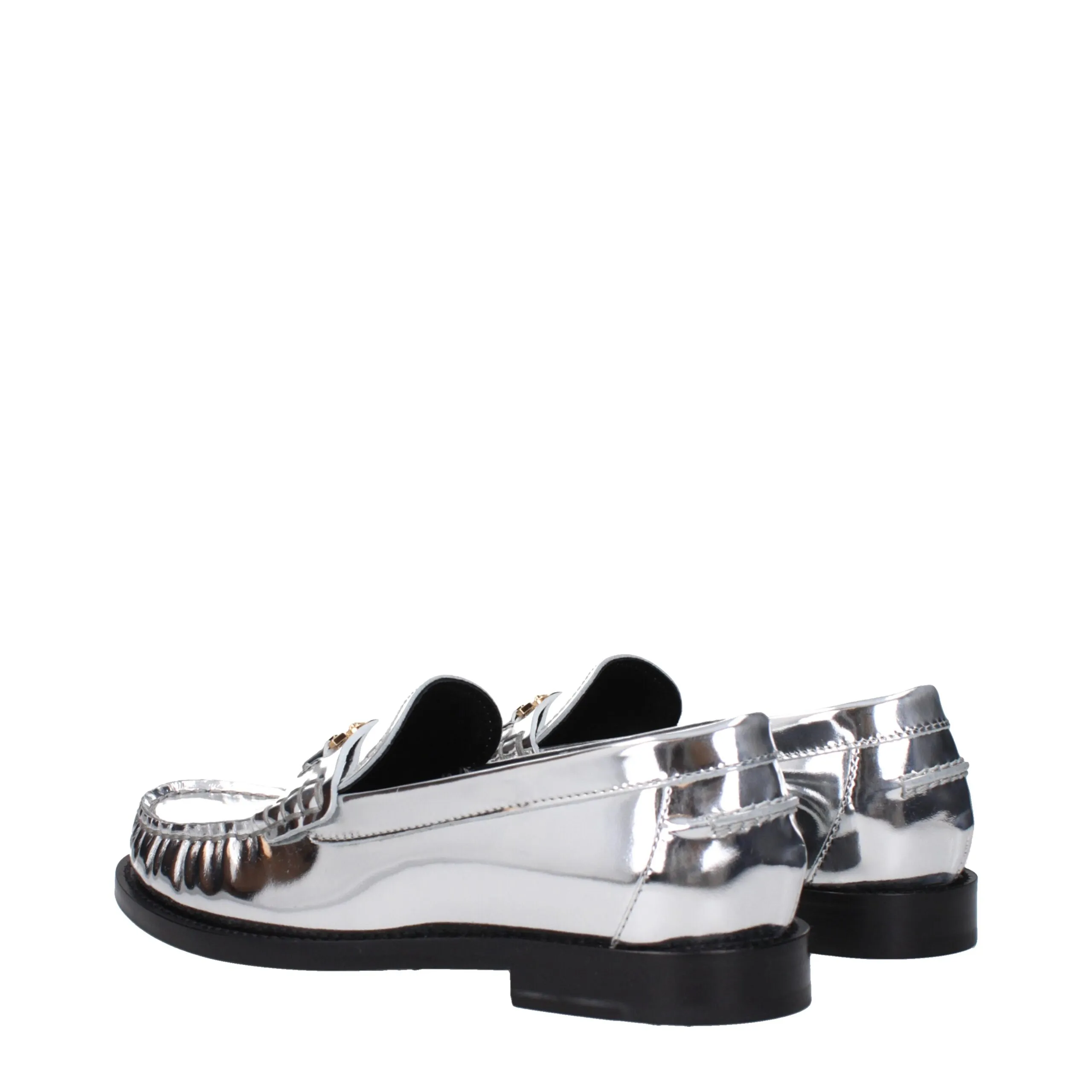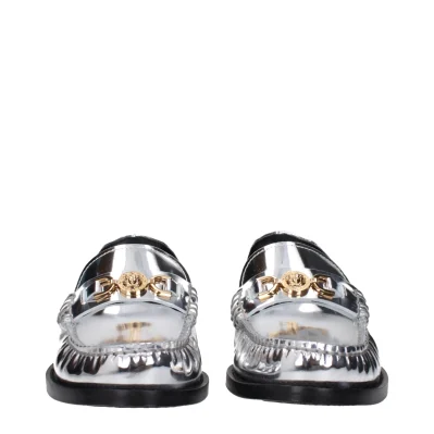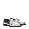 The product with MPN 10121231A043021E01V and code F83780 leather in silver is a loafers designed by Versace. It has features like front logo, metallic effect.