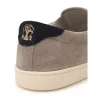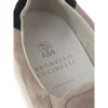 Brunello Cucinelli Tortora Suede Slip On. Classic line, round toe, contrasting white rubber sole, back detail in black with micro ‘Solomei’ print in gold. Composition: 100% Leather. Inner sku: 24SET39
