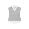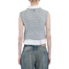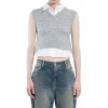 – Composition: 89% Acrylic 3% Elastane 8% Nylon – Sleeveless – V-neckline – Classic collar – Machine wash (delicate) – Filling: 100% cotton – Back engraved-logo heart charm – Layered ribbed and exposed shirt hems – Cropped hem – Made in China – Gender: WOMEN –