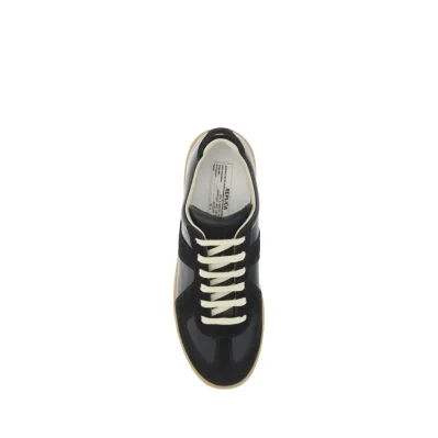 Calfskin Sneakers by Margiela, suede detailing, contrasting gum sole, front lace-up closure, paneled design, front logoed press-stud tab.