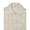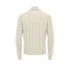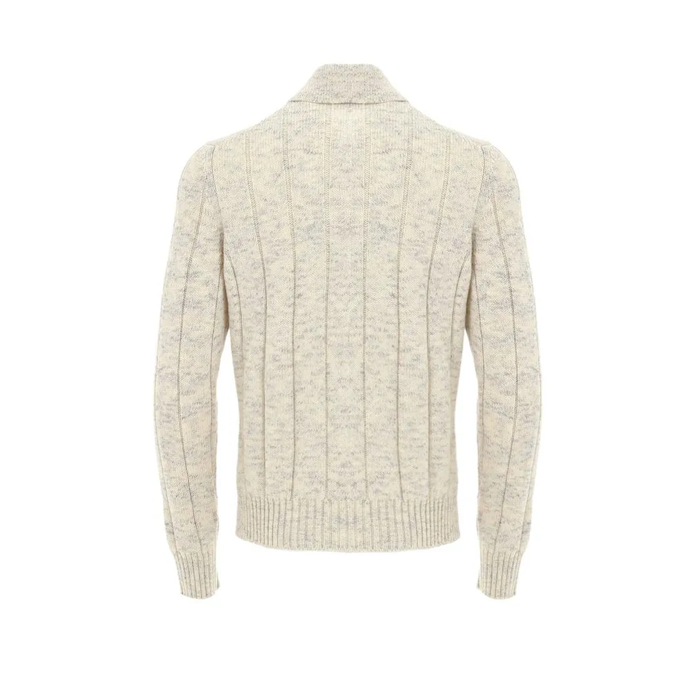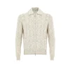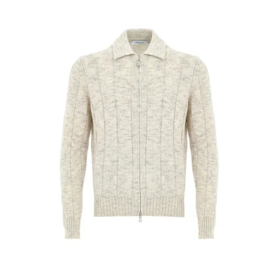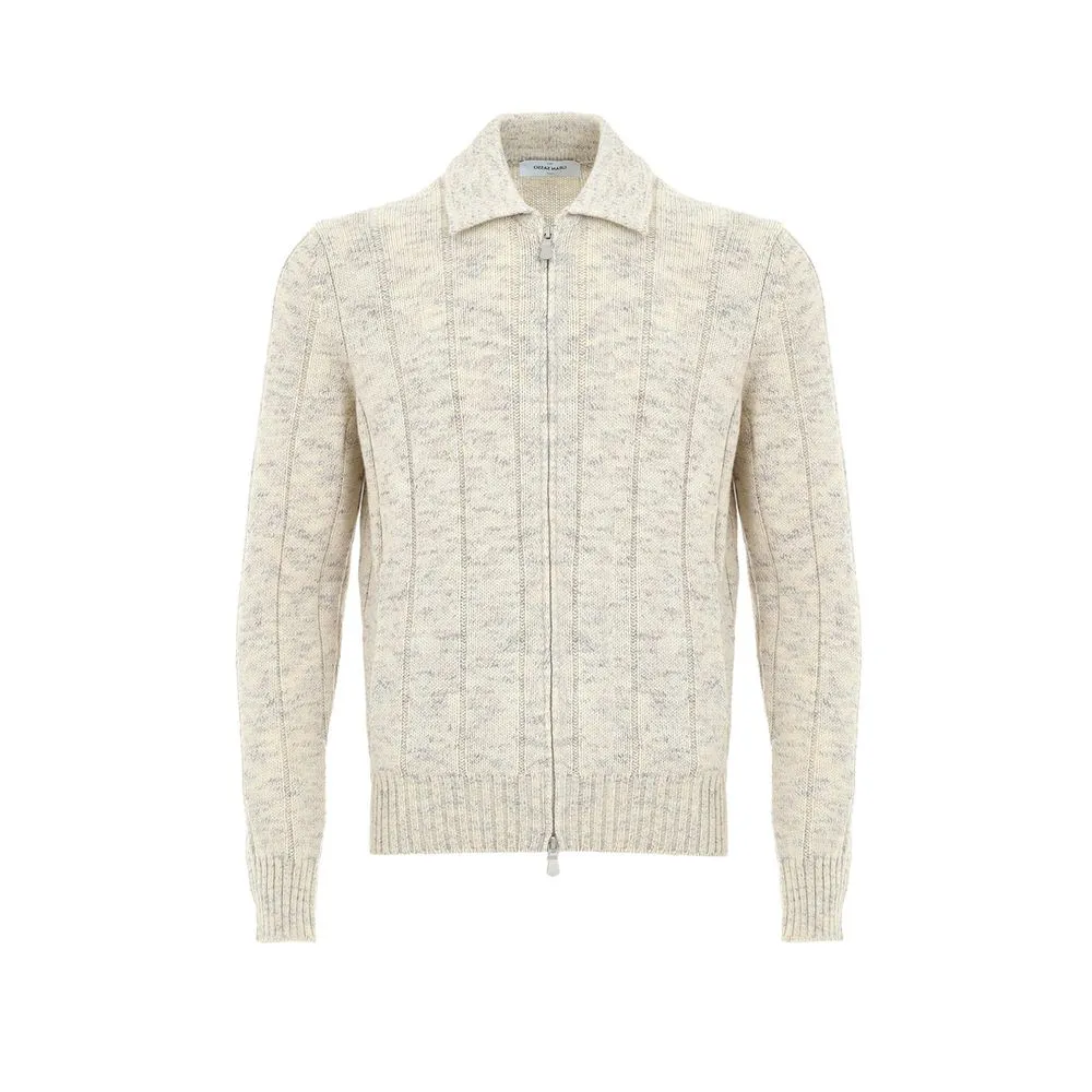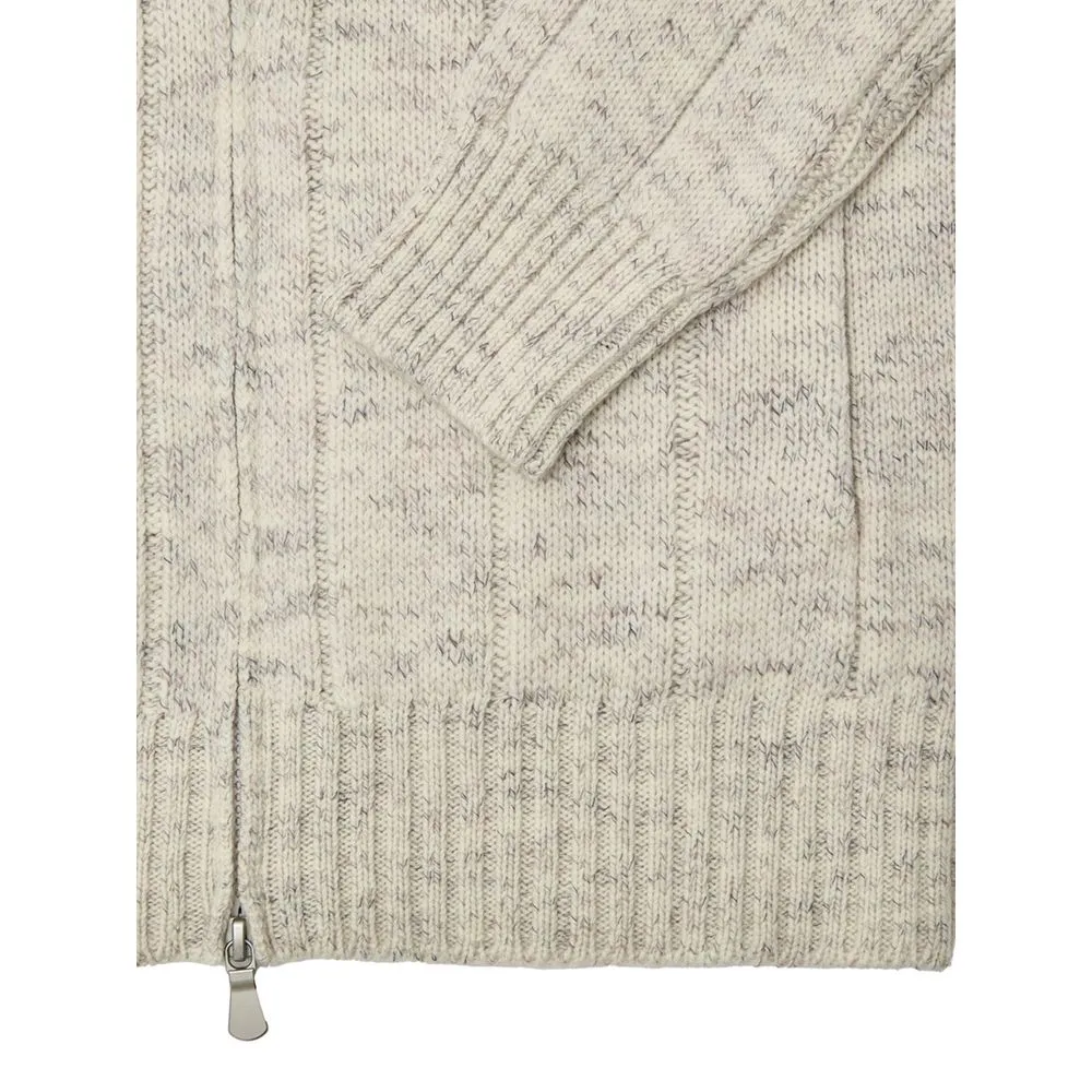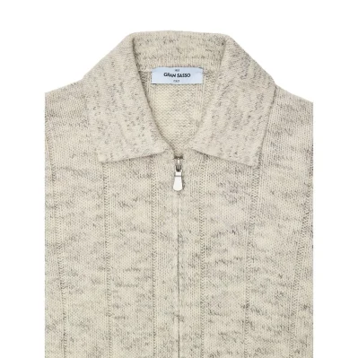Gran Sasso Zip-Up Wool Cardigan. Ice-colored, wide-ribbed wool with contrasting yarn details, two side welt pockets, front zip opening, classic shirt collar.