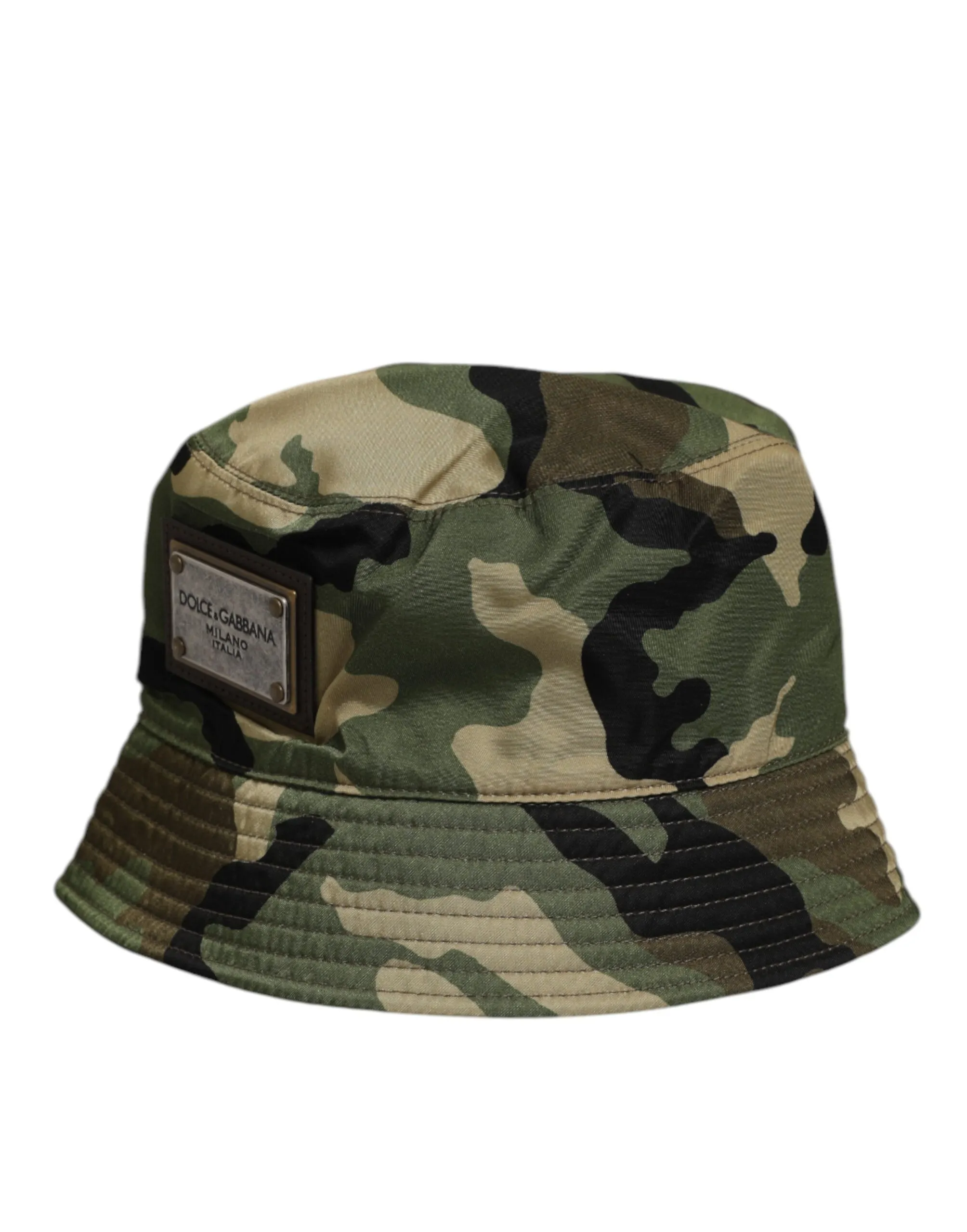 Gorgeous brand new with tags, 100% Authentic Dolce & Gabbana hat, crafted in Italy from premium material. Featuring a striking green camouflage print and a bold metallic Dolce & Gabbana Milano logo plaque on the front, this bucket hat blends rugged utility style with luxury detailing.