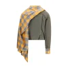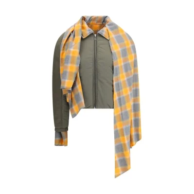 The Maxi-Puffer Jacket by Marbell combines comfort with contemporary style. Made from quilted down, it features long sleeves, a front zip closure, and an integrated maxi scarf with a plaid pattern, adding a distinctive and versatile detail.