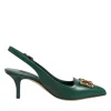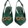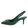 Gorgeous brand new, 100% Authentic Dolce & Gabbana slingbacks are crafted from premium green leather, radiating elegance with a bold, romantic flair. The standout feature is the signature gold-tone “AMORE” lettering on the heels, symbolizing love and Italian charm. Designed with a pointed toe and adjustable slingback strap for a secure fit, these heels bring sophistication and statement style to any refined ensemble.