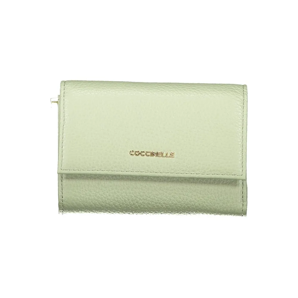 Discover elegance with an edge. This Coccinelle Metallic Soft Wallet is the epitome of sophistication, offering a modern twist to your financial essentials. Crafted in Italy from the finest leather, it boasts a sleek green hue that makes a statement. With three compartments and dedicated spaces for cards, all your valuables stay organized. An external coin pocket adds functionality, while the logo marks a sign of luxury. Zip and snap closure ensure everything is secured in style.