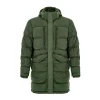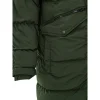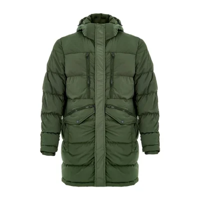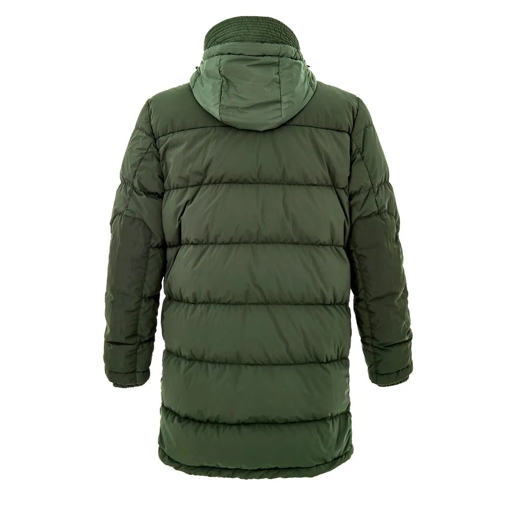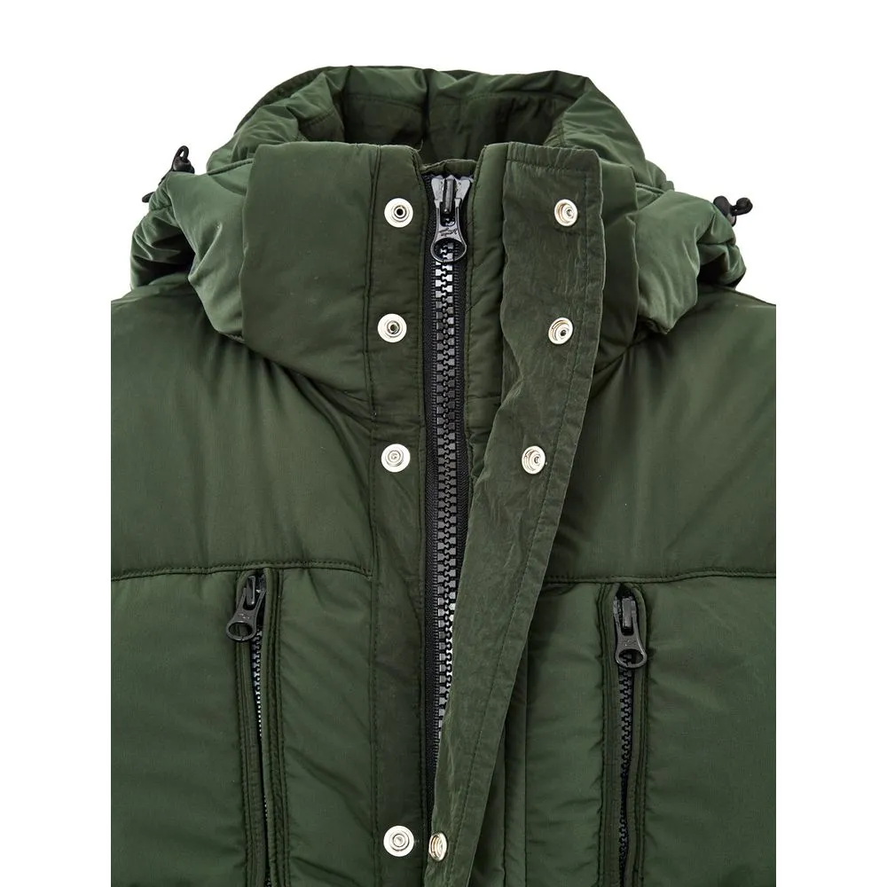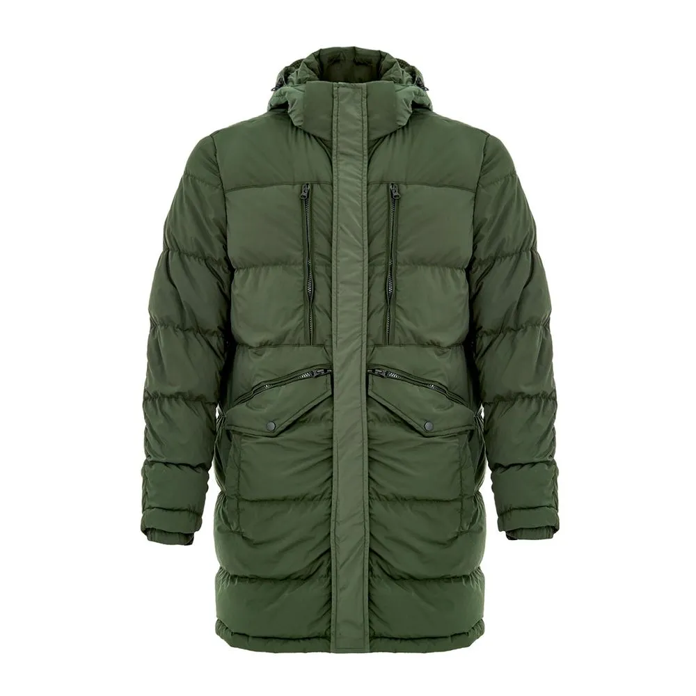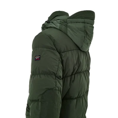 Paul & Shark Green Padded Down Jacket. Front zip fastening with covered buttons, two side pockets with double openings, two front zip pockets, and inside pockets. High collar with adjustable and removable hood with visor. Logo applique on the sleeve.