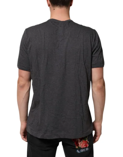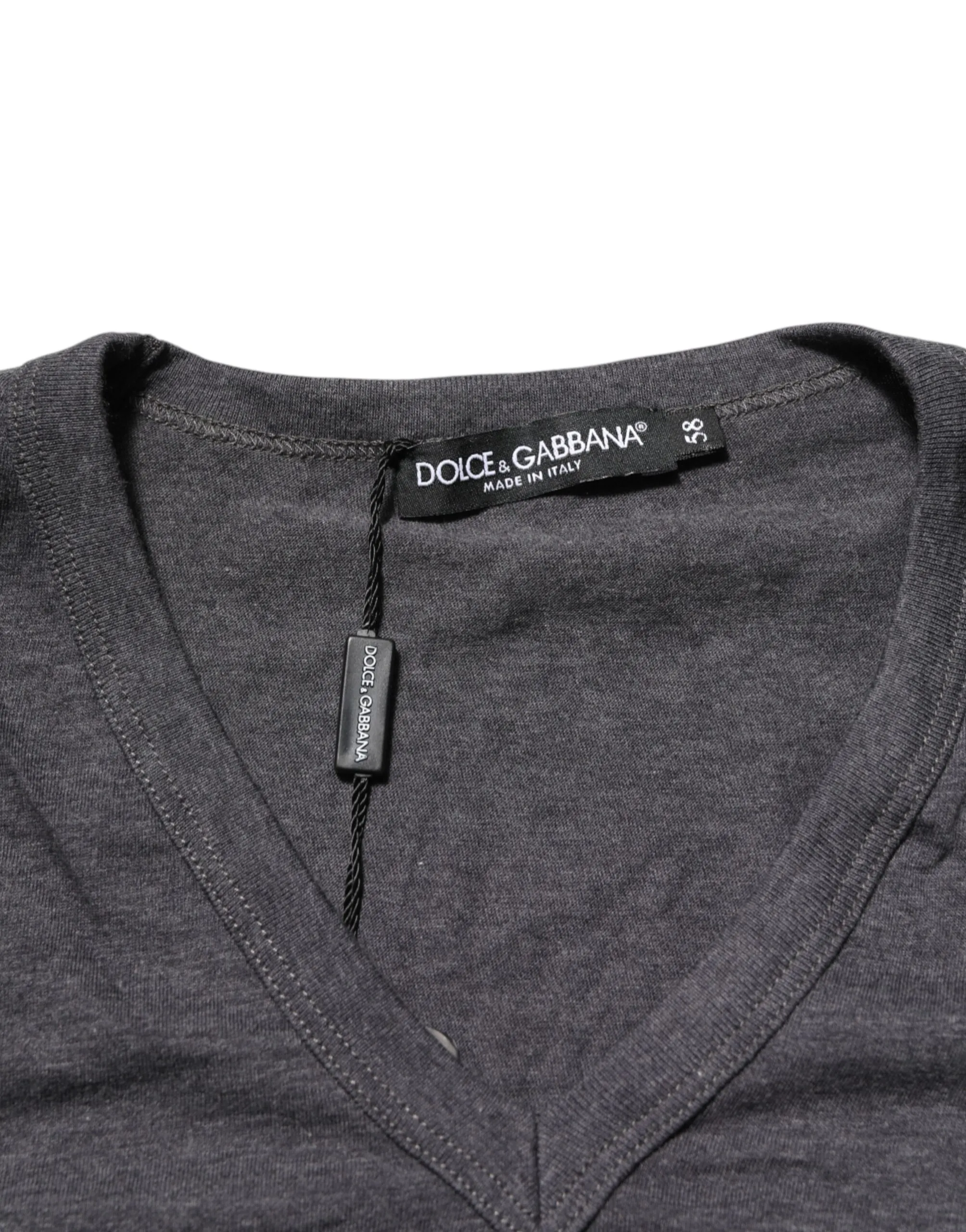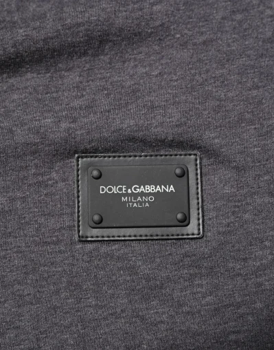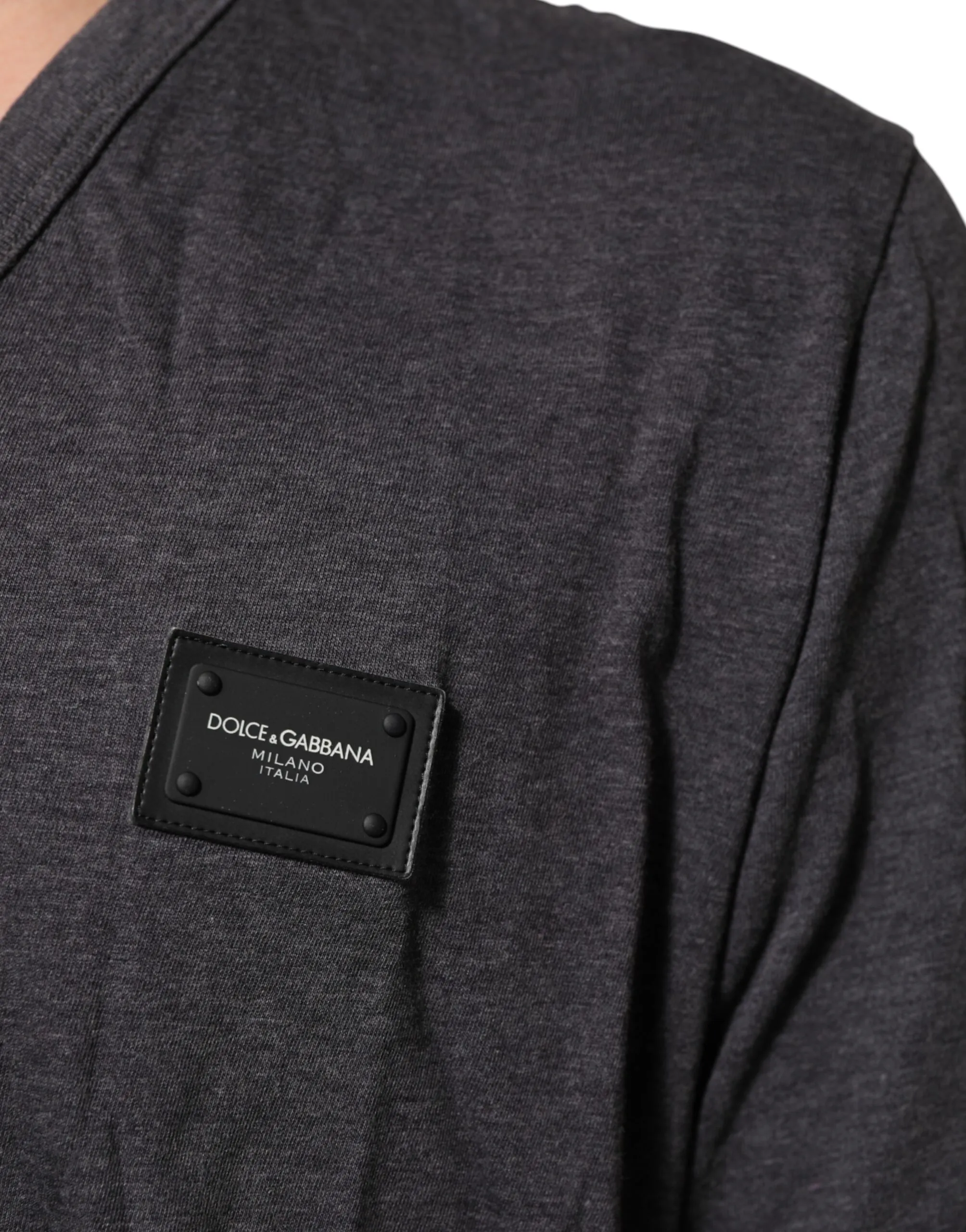 Gorgeous brand new, 100% Authentic Dolce & Gabbana men’s V-neck T-shirt in melange grey. Features a front leather logo plaque with silver-tone lettering and short sleeves. Crafted from soft cotton for everyday comfort and style.