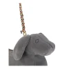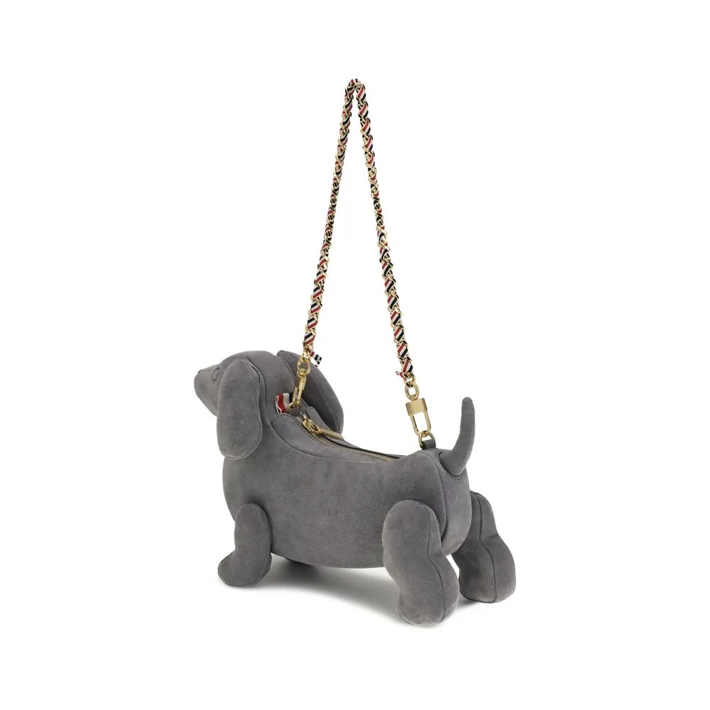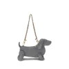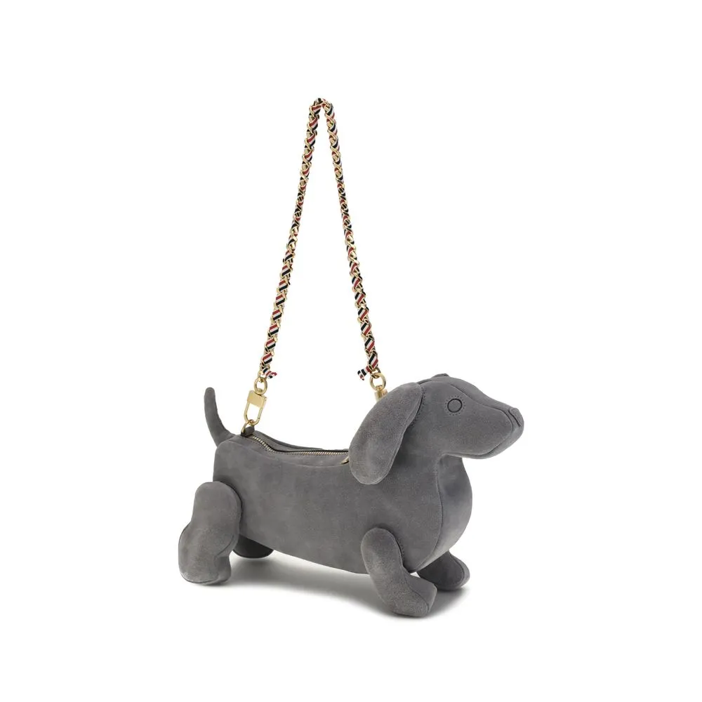 Hector suede Shoulder Bag by Thom Browne is an elegant and original accessory inspired by the iconic Hector dachshund silhouette. Featuring a removable chain strap with tricolor ribbon, it combines playful design with the brand’s signature sophistication. The single compartment interior provides essential space for personal items, making this bag a perfect balance of style and functionality.