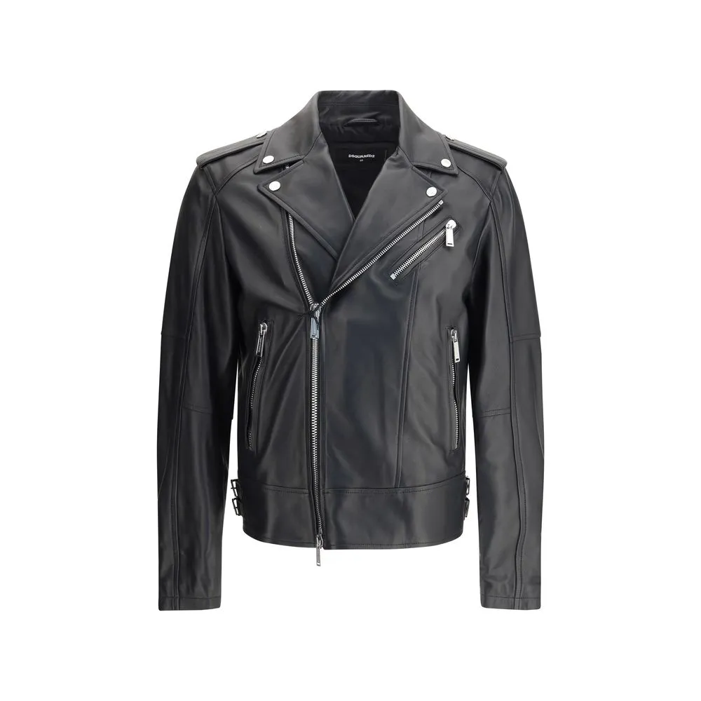 Dsquared2’s Kiodo leather Jacket features a lapel collar and a double-breasted, double-slider zipper closure. The functional design includes two zippered pockets, a heart point pocket also zippered, and zippered sleeve bottoms. Distinctive details such as snap-buttoned frogs on the shoulders and buckle straps sewn to the hips complete this garment with a strong contemporary character.