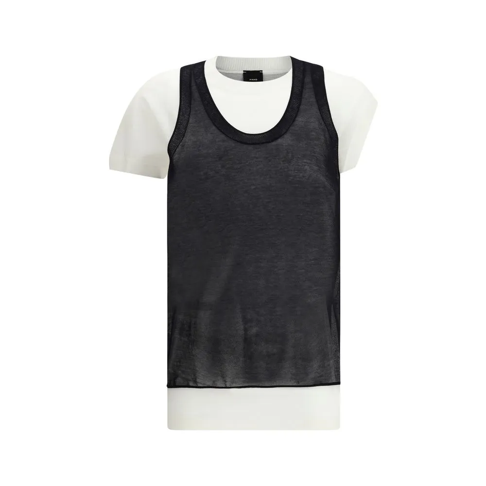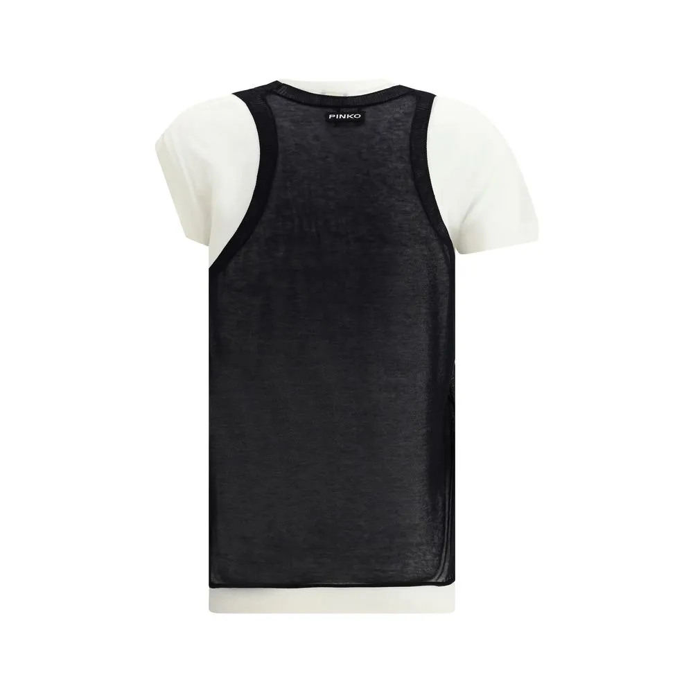 Pinko’s knit T-Shirt is a versatile and modern piece featuring a double-layered design and one sleeve longer than the other. The ribbed crew neck and rounded neckline offer a comfortable fit and refined detail. On the back, an applique patch with the brand’s iconic logo lends a touch of recognition and style. Perfect for a casual yet polished outfit, this T-shirt is a must-have for those who love a chic, casual look without sacrificing quality and simplicity in design.
