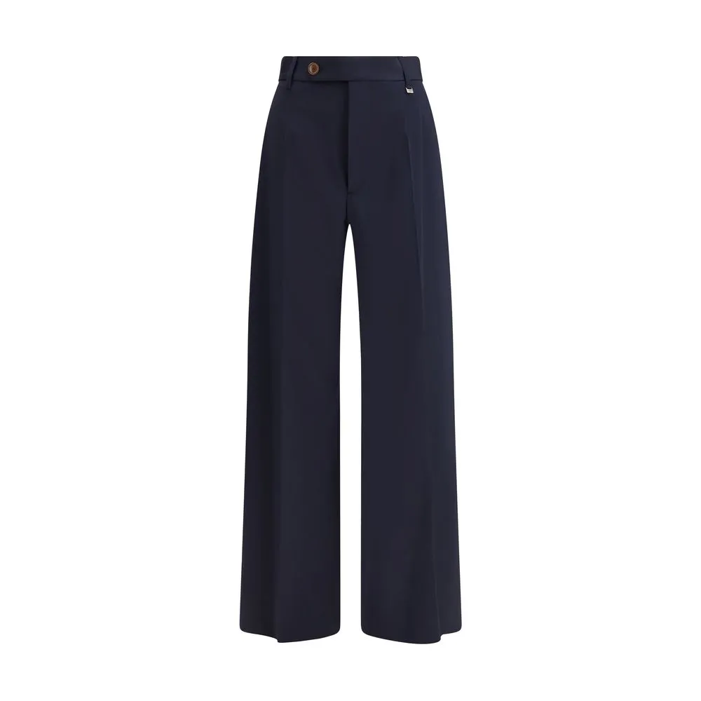 Vivienne Westwood’s virgin wool Lauren Pants have a wide-leg cut and sophisticated style. Featuring a front zipper and button closure, they have belt loops at the waist, two slash pockets at the hips and a welt pocket at the back. An elegant and contemporary piece, perfect for completing refined looks with a touch of character.