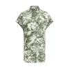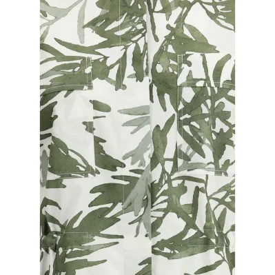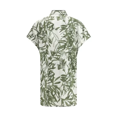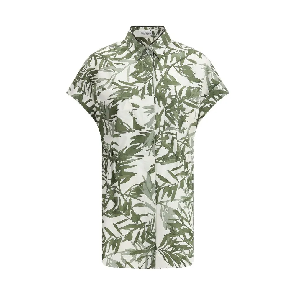 Brunello Cucinelli’s Long Shirt features a classic collar embellished with the brand’s iconic shiny beads. The front closure with concealed buttons lends a clean, elegant look, while the elasticized waistband ensures a comfortable, modern fit. Two patch pockets on the front with flaps add functionality and style. The leaf print completes the design, making this unique and sophisticated garment perfect for a refined and contemporary look.