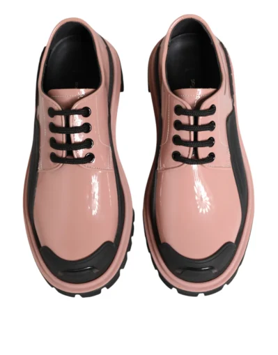 Gorgeous brand new with tags, 100% Authentic Dolce & Gabbana lace-up shoes. Crafted in Italy from 100% calf patent leather in a chic Light Powder Pink hue, they feature contrasting black rubber detailing and a chunky lug sole for a contemporary edge. Perfect for elevating casual and streetwear looks.