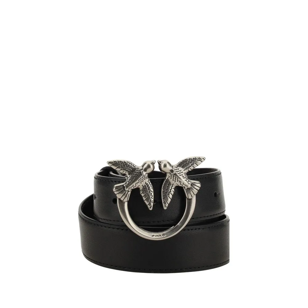 Calfskin Love Berry Belt by Pinko, smooth leather design, round buckle with iconic Love Birds logo plaque. Thickness: 3 cm.