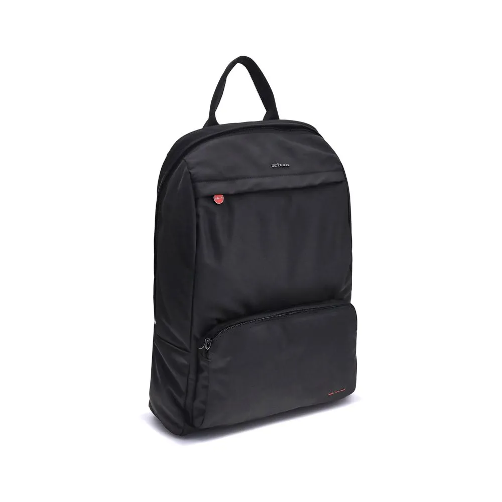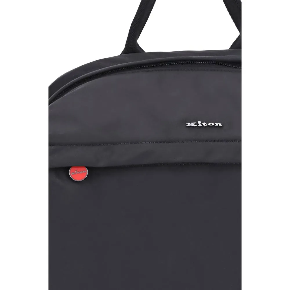 Nylon Backpack by Kiton with fabric top handle and two front zippered pockets. It features distinctive red stitching that enhances the design, silver metal logo and main zipper closure. The mesh back lining provides breathability, while the two adjustable shoulder straps ensure comfort and practicality for everyday use.