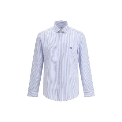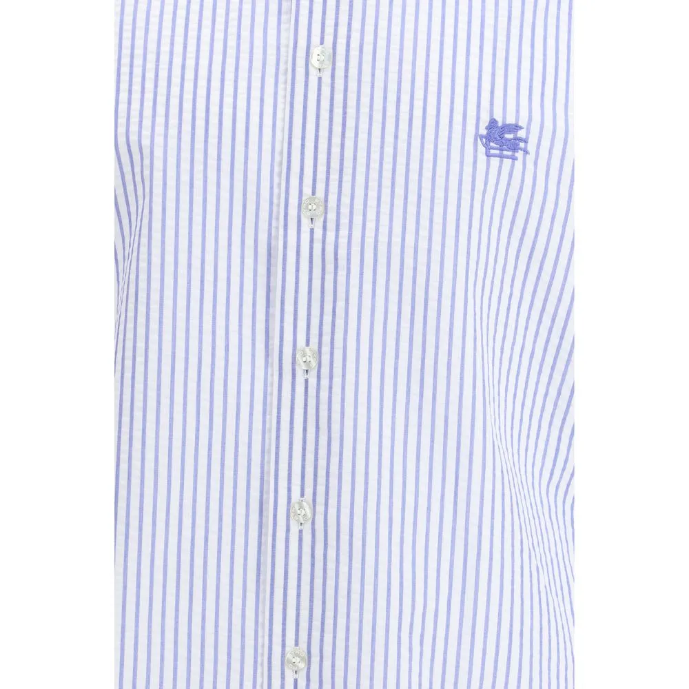 The striped cotton Shirt by Etro is crafted from a refined textured fabric and detailed with an embroidered Pegaso logo on the left chest. Featuring a classic collar, button fastening, and rounded button cuffs, it is finished with a curved hem, embodying the brand’s signature sophistication.
