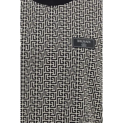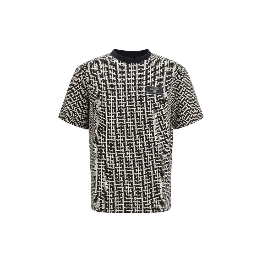 The jacquard T-shirt with PB labyrinth monogram by Balmain is crafted using a jacquard technique that creates the iconic all-over pattern. It features a round neckline with contrasting ribbed trim, short sleeves, and a Balmain Couture fabric label on the chest. Designed with a regular fit, it delivers a refined yet everyday-ready look.
