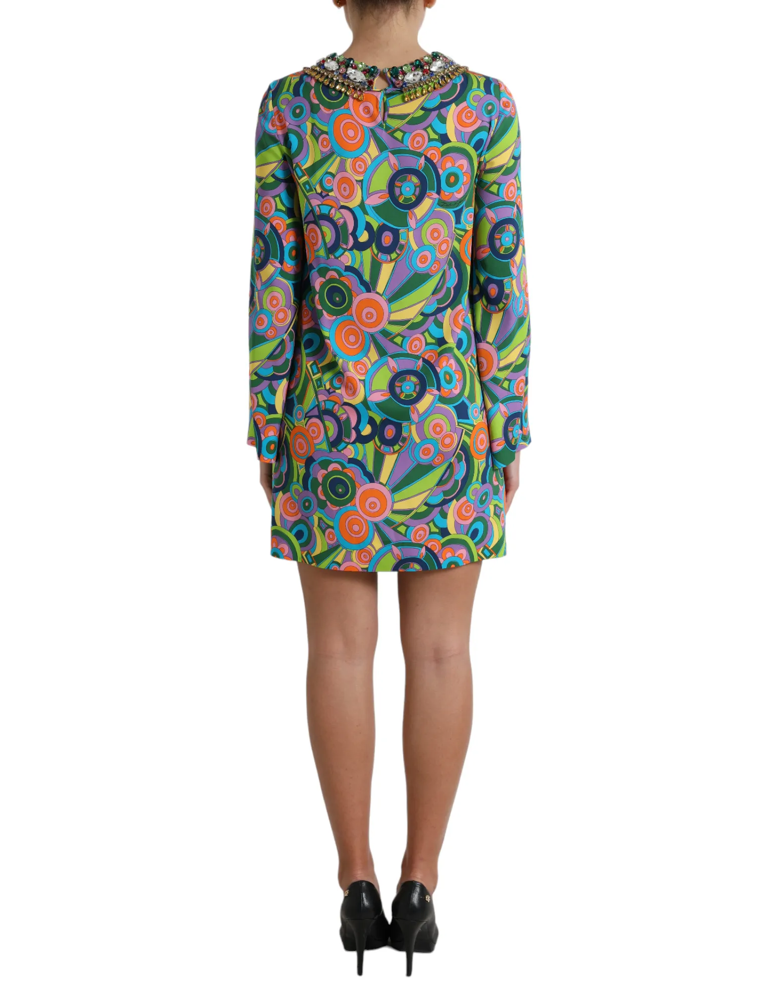 Gorgeous brand new with tags, 100% Authentic Dolce & Gabbana multicolor geometric print silk mini dress with crystal embellishments.