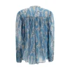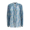 The pleated Shirt with band collar by Etro is crafted from a lightweight fluid fabric featuring the brand’s iconic Paisley and foliage motif. It features a front button fastening, single-button cuffs engraved with the Etro logo, and delicate pleating for a refined, feminine silhouette. The band collar lends a modern, sophisticated finish.