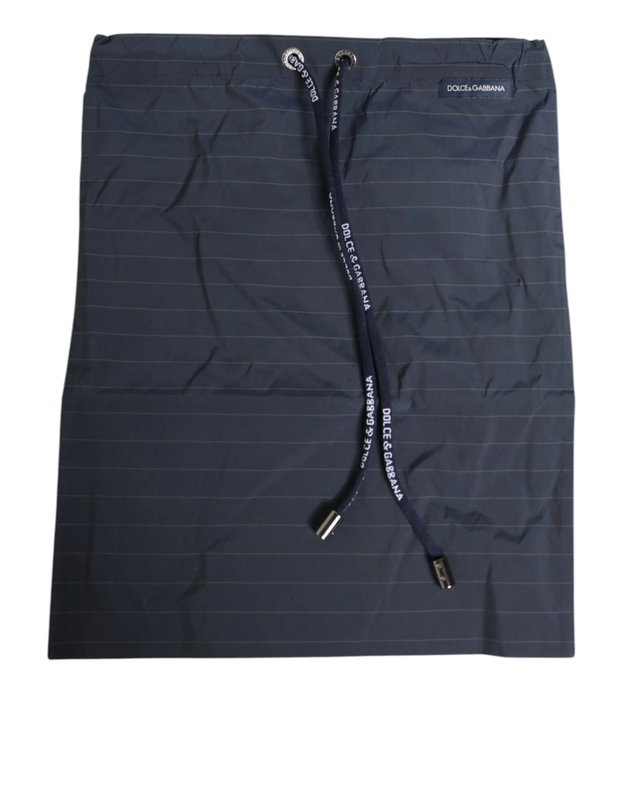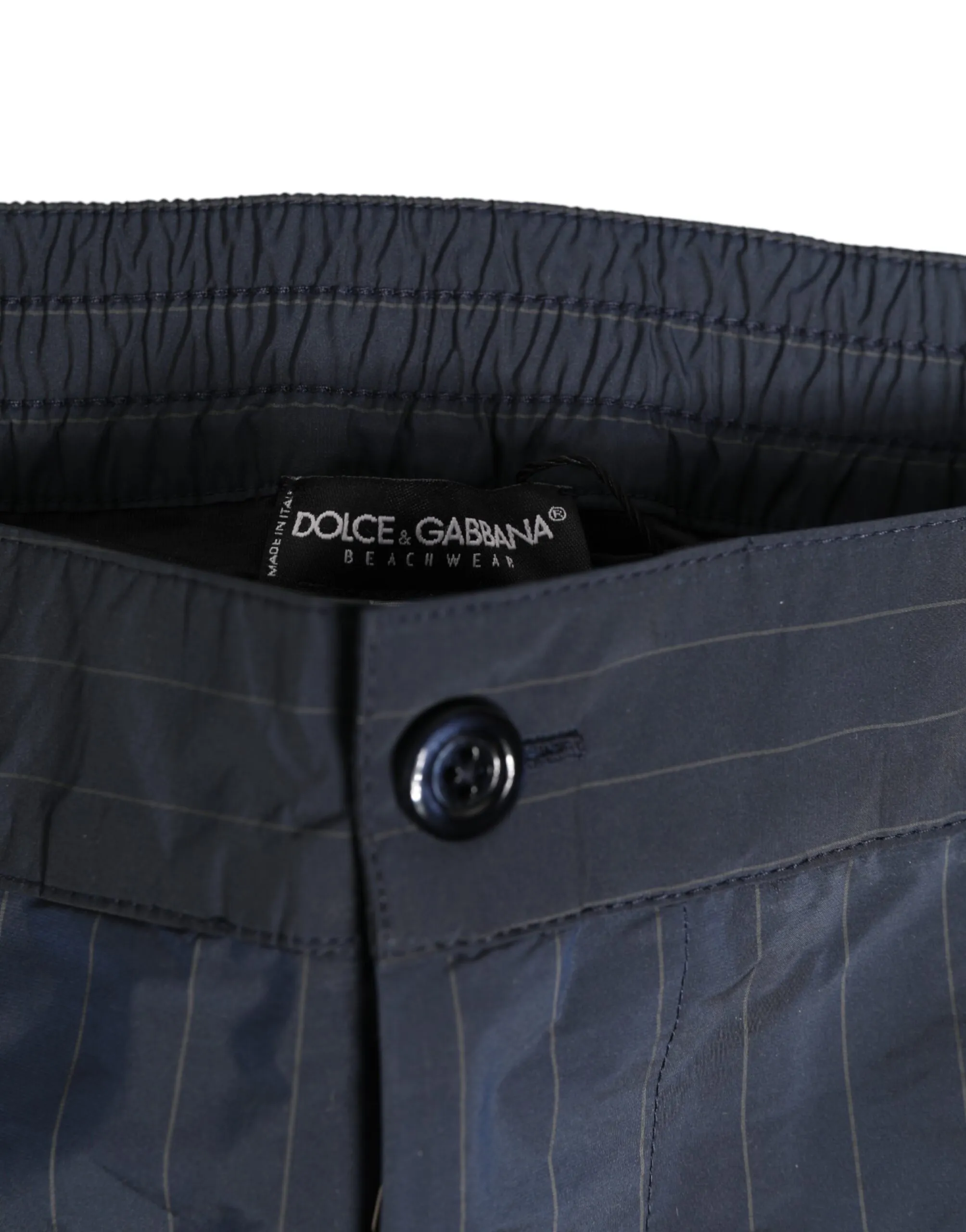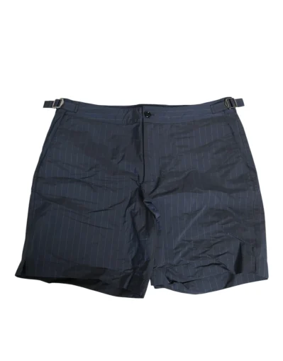 Absolutely stunning, 100% Authentic brand new Dolce & Gabbana men’s swimwear. These navy blue pinstripe shorts feature a tailored design with side buckle adjusters, button closure, and practical side pockets. Crafted from high-quality polyester, they ensure durability and comfort, perfect for both beach and casual wear.