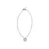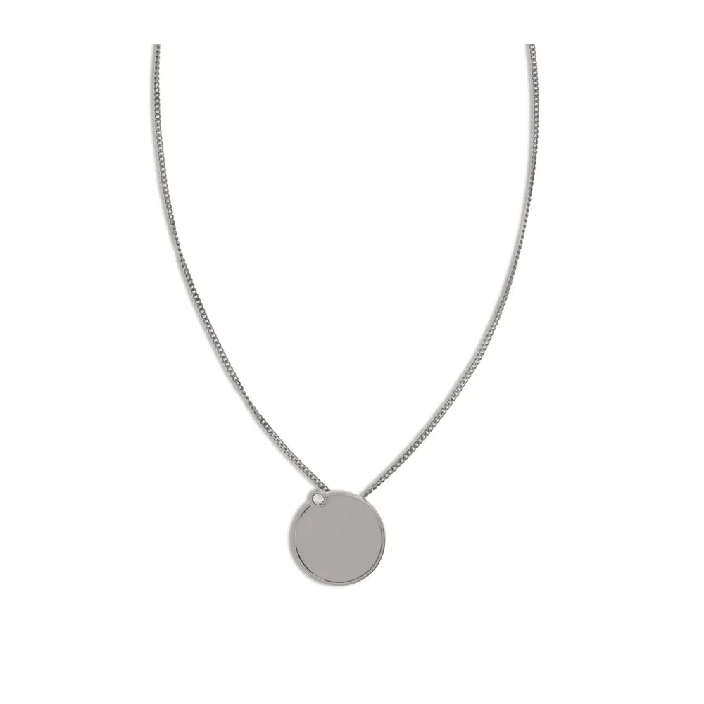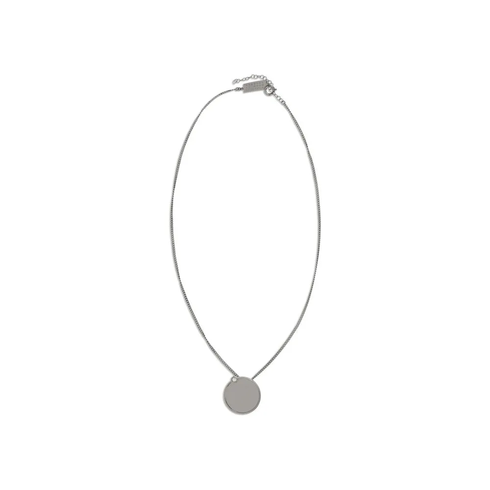 Necklace by MM6 stands out for its minimal and elegant design, featuring a round plaque embellished with a delicate glitter detail. The hook-and-eye closure provides security and practicality, while the engraved logo on the back adds a touch of discreet sophistication, making this jewelry a versatile and sophisticated accessory.