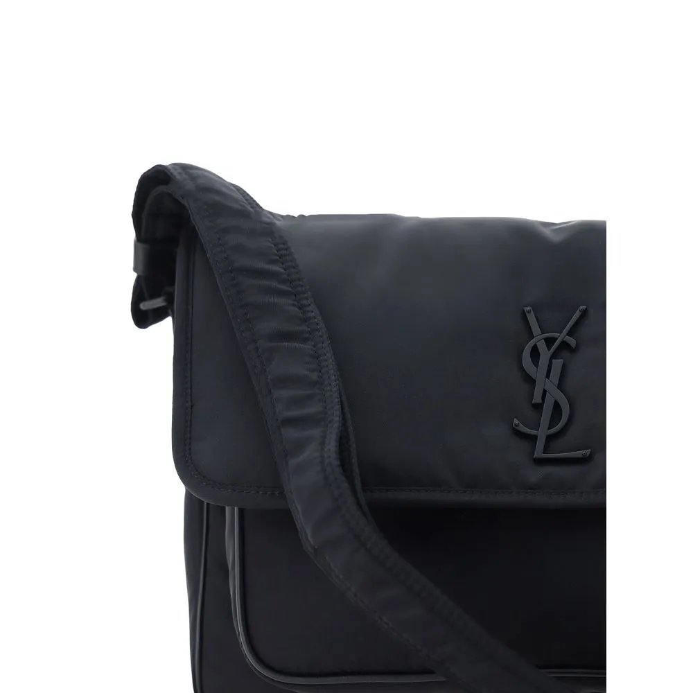 Niki Camera Shoulder Bag by Saint Laurent, front closure by magnetic flap, all-over padded and quilted chévron fabric design, embossed and matching iconic YSL brand logo plaque on front, triple interior compartment, removable and adjustable shoulder strap.