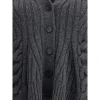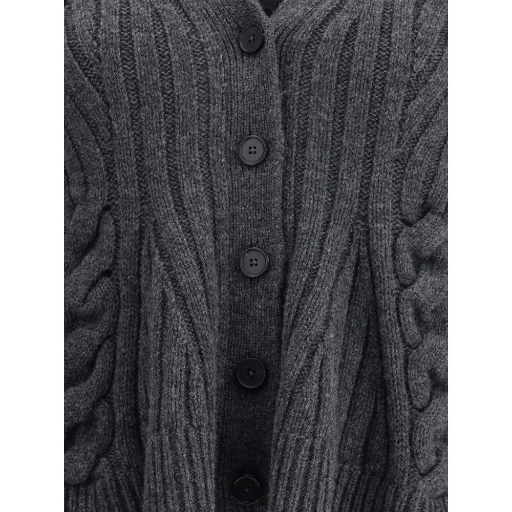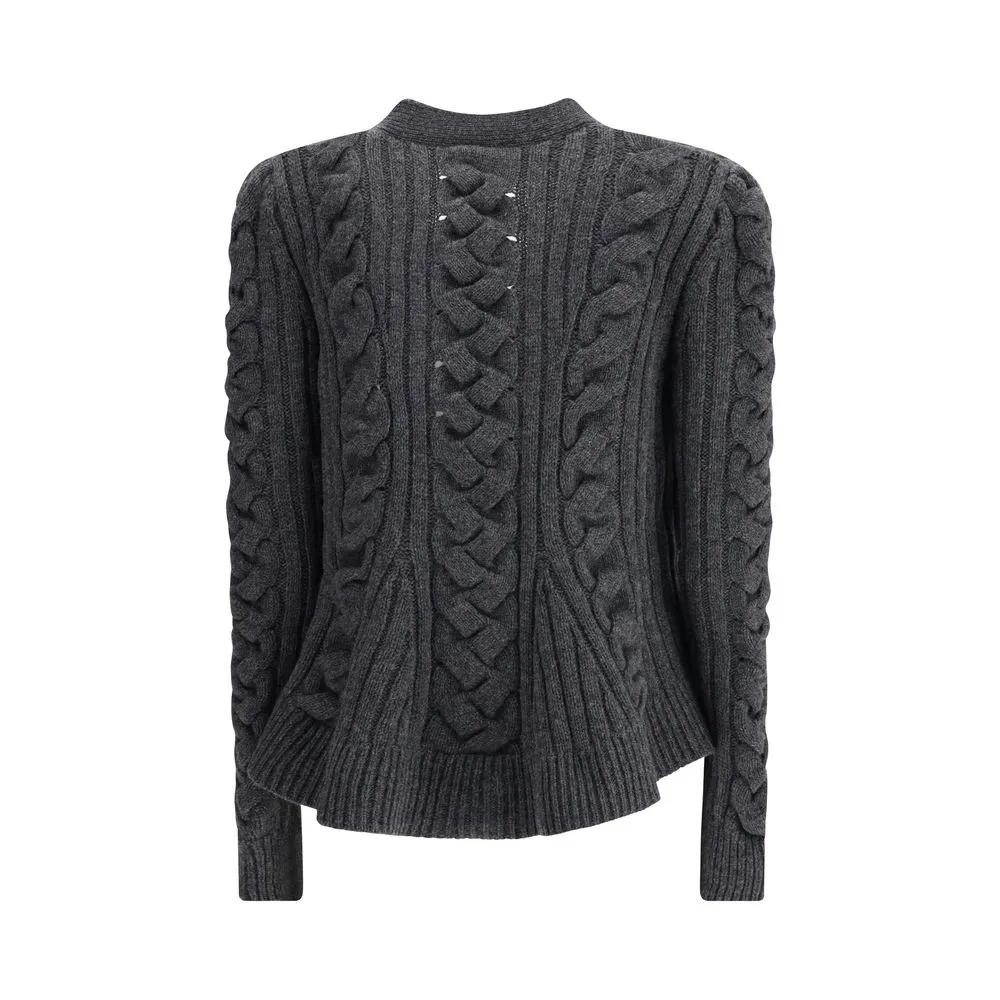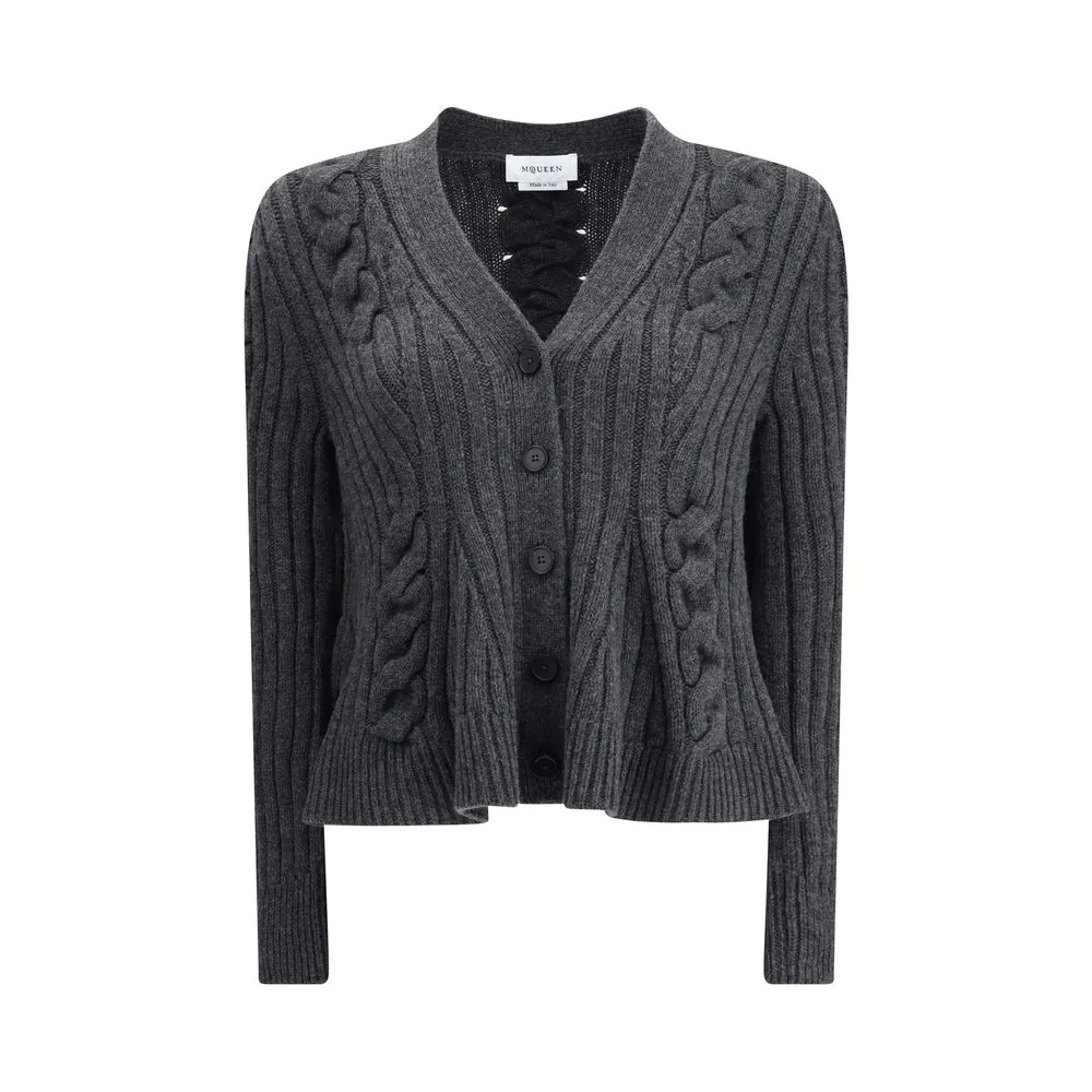 The Peplum Cable Cardigan by McQueen is crafted from a fine wool and cashmere blend, featuring a classic cable-knit design that enhances its rich texture. Designed with a slim fit at the waist that flares elegantly into a peplum hem, it includes a crew neckline, long sleeves with cuffs, and button fastening. A piece that merges timeless craftsmanship with modern sophistication.