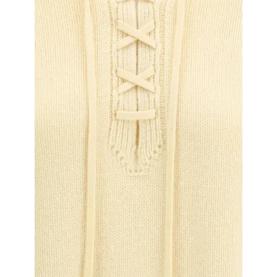 The pure cashmere Sweater by Ermanno Scervino embodies the perfect balance between craftsmanship and contemporary vision. A highlight of the Fall/Winter 2025–26 runway, it stands out for its wide ribbed neckline that frames the décolleté and the deep V-neck laced closure, a refined detail that blends sporty allure with timeless elegance. Along the sides, hand-woven cashmere ribbons create delicate braids that celebrate the Maison’s artisanal mastery, while ribbed finishes at the hem, cuffs, and collar define the silhouette with softness and structure. Entirely crafted from cashmere, this piece expresses natural sophistication and the art of knitwear at its highest form.