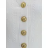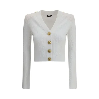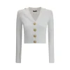 Balmain’s Ribbed and braided Cardigan combines elegance and structure in a distinctive design. Featuring a V-neckline, it features structured shoulders with decorative tabs and buttons, recalling the military aesthetic dear to the Maison. The front closure is completed with iconic embossed buttons, the unmistakable signature of Balmain style.