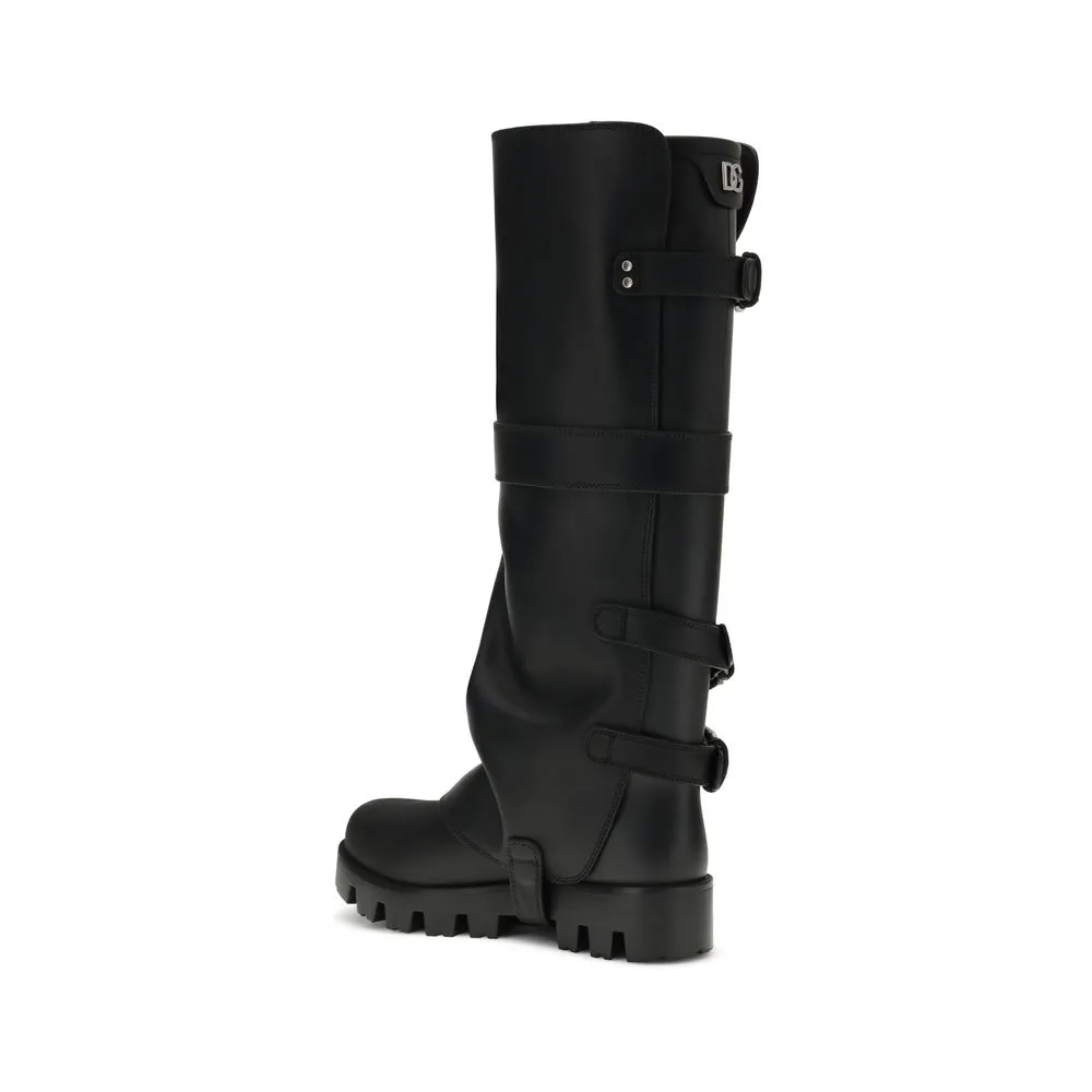 Rubber and leather high Boots by Dolce&Gabbana combine functionality and style in a bold, contemporary design. Based on the Bernini line, they feature a durable TPU sole and a leather-covered latex fussbett footbed for superior comfort. The crisscross DG logo and custom label on the insole add iconic details, while the ruthenium electroplated finish lends an elegant and distinctive touch.