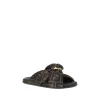 Fendi’s Satin Slide Sandals combine elegance and comfort with their flat sole and silk upper, decorated with the brand’s distinctive FF pattern. The application of a gold Fendi signature ring adds a touch of luxury and sophistication. These sandals are ideal for those looking for a sophisticated and versatile accessory, perfect for a chic and timeless look.